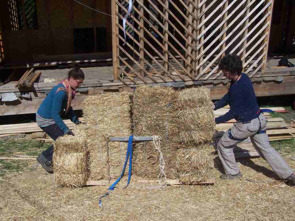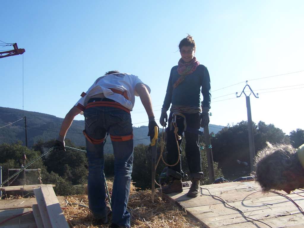 Les bottes de paille en toiture (et en plancher) c’est excellent pour l’isolation et la respiration du bâtiment. Excellent pare-feu également.