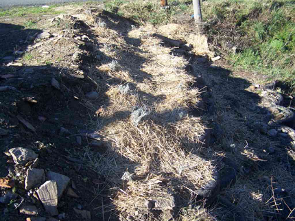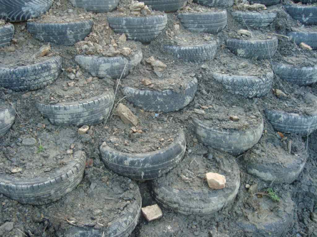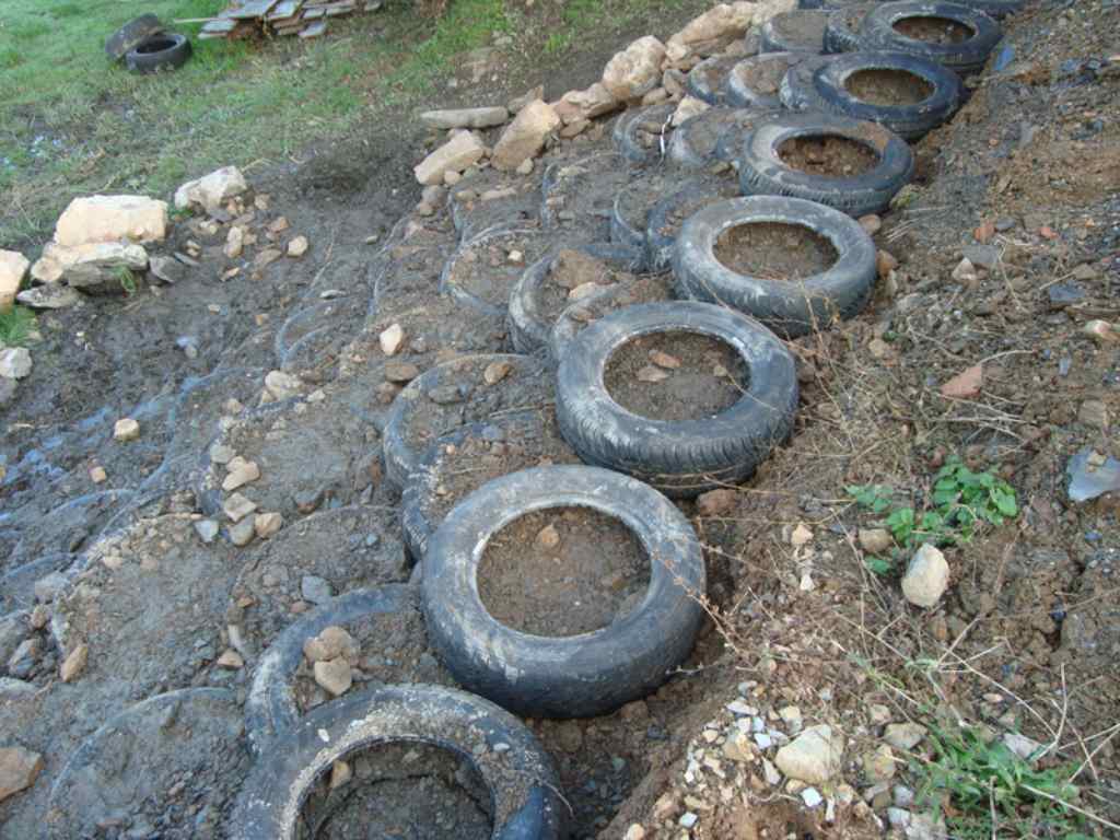 • Des pneus sont alignés, remplis de terre, et les rangs se chevauchent pour assurer la stabilité.
