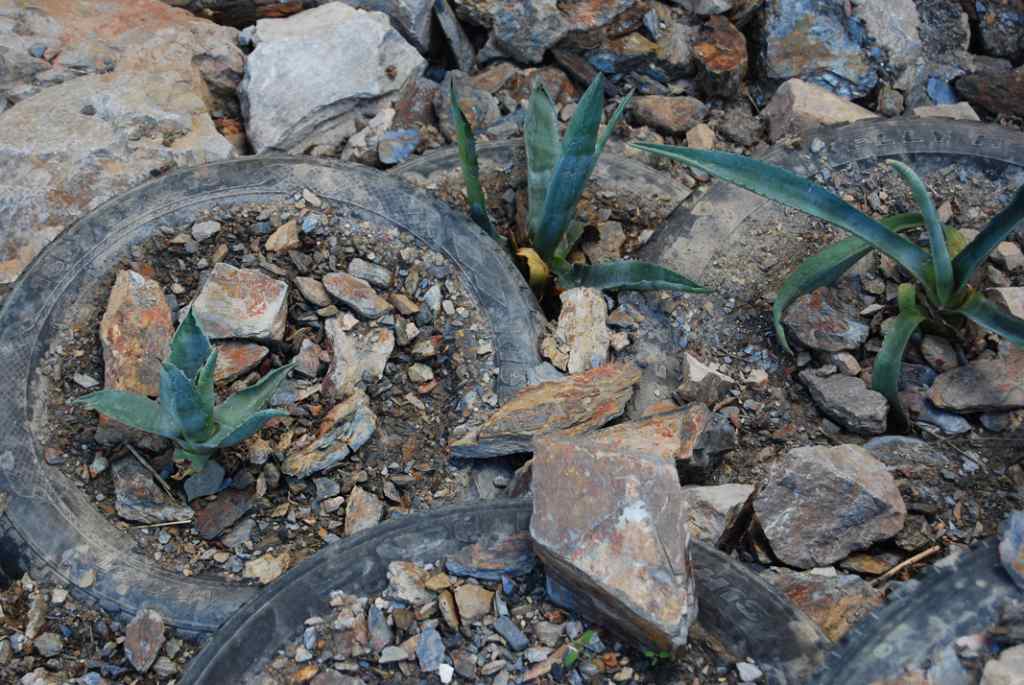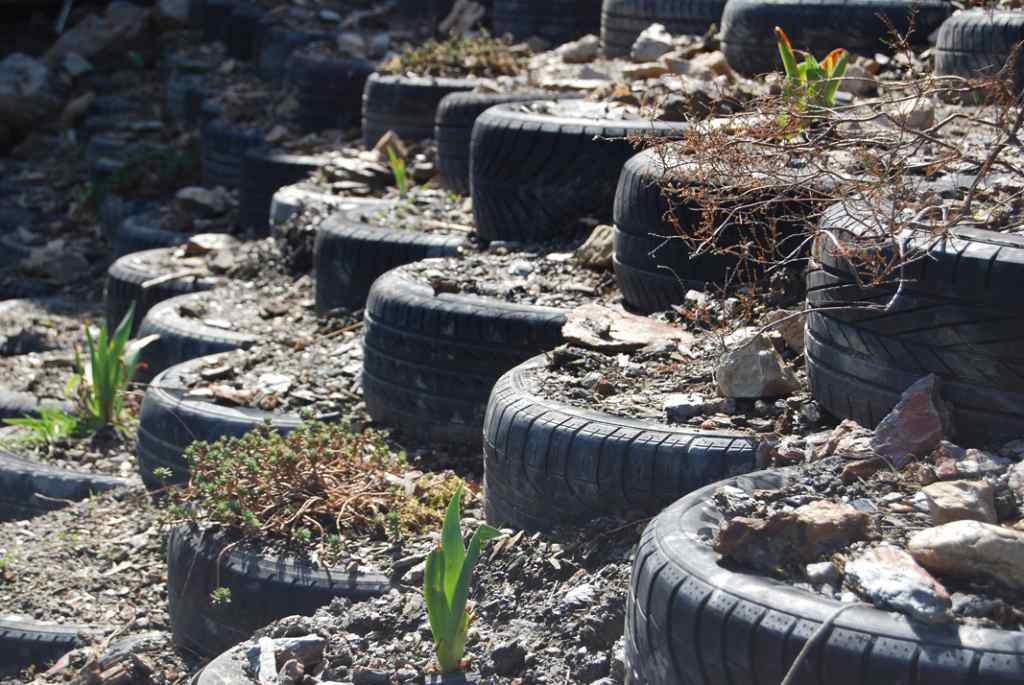 Les pneus remplis de terre deviennent invisibles sous les plantations au fil du temps.